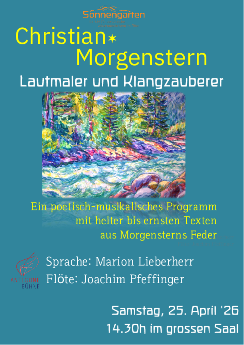 Christian Morgenstern ist in eine Familie von Malern hinein geboren. Wie er sich entschieden hat, den Pinsel mit der Feder zu vertauschen, wie aber trotzdem das Malererbe in seiner Dichtung vielfältig durchscheint, davon handelt dieses Programm. In Erzählungen zu seinem Leben, Briefstellen, Erinnerungen von Zeitgenossen und vor allem seinen Dichtungen wird sein Werdegang als Künstler und Mensch hör-und erlebbar gemacht.